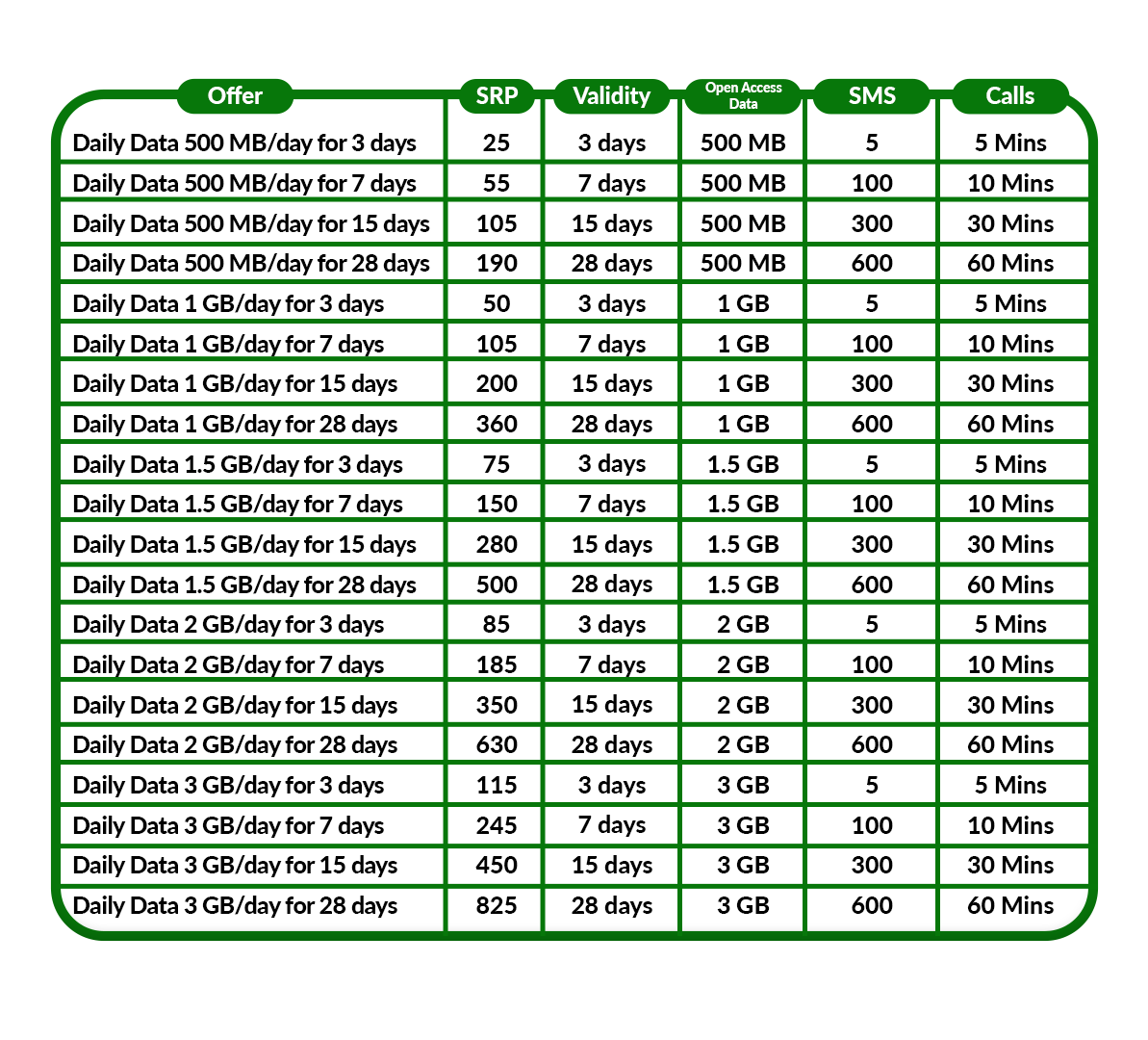 Choose from daily data options between 500 MB and 3 GB, and decide how long your data lasts — from 3 to 28 days. Every plan includes open-access data, so you can browse, stream, post, or play on any app or website without restrictions. You’ll also get free SMS and call minutes to stay connected with friends and loved ones.